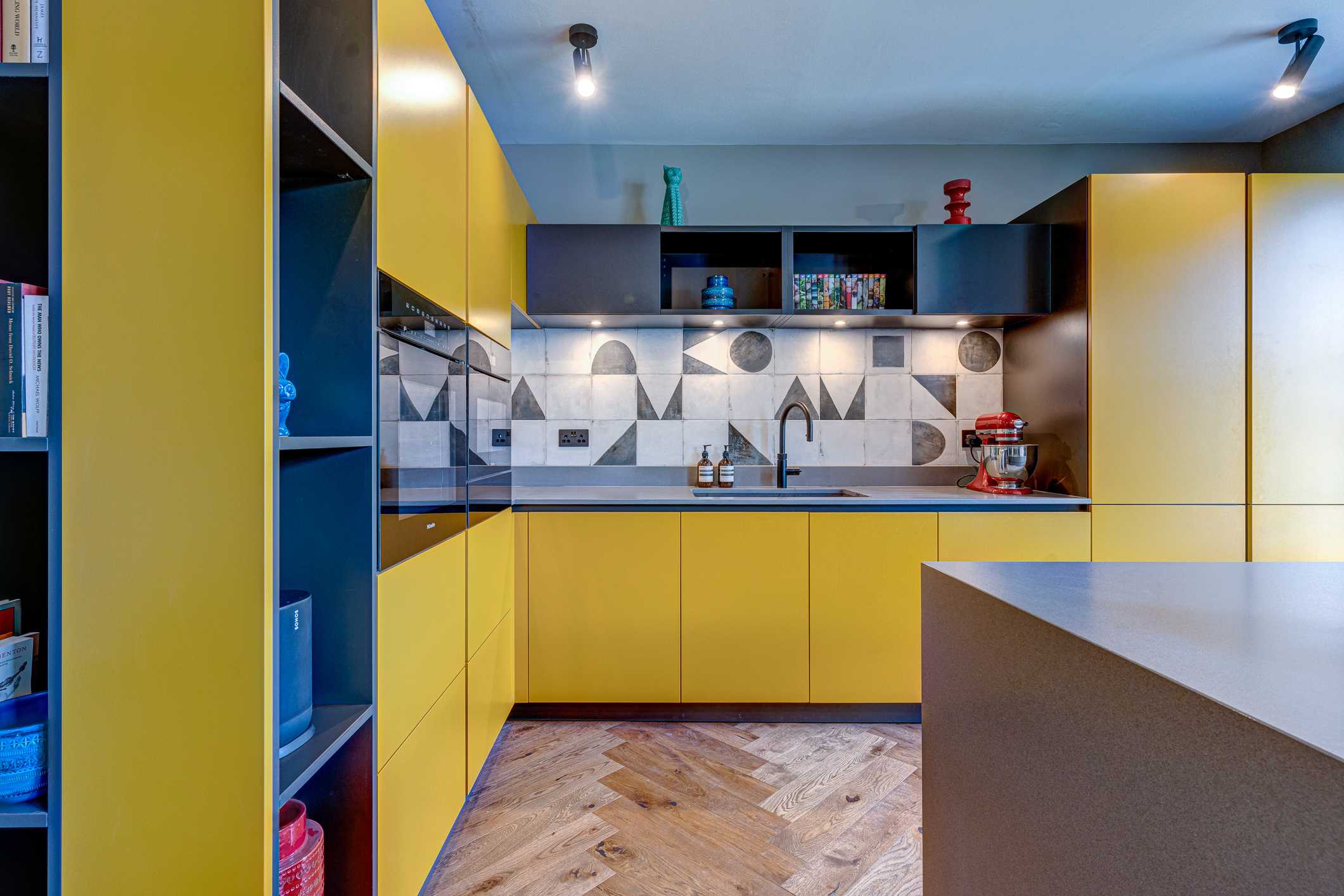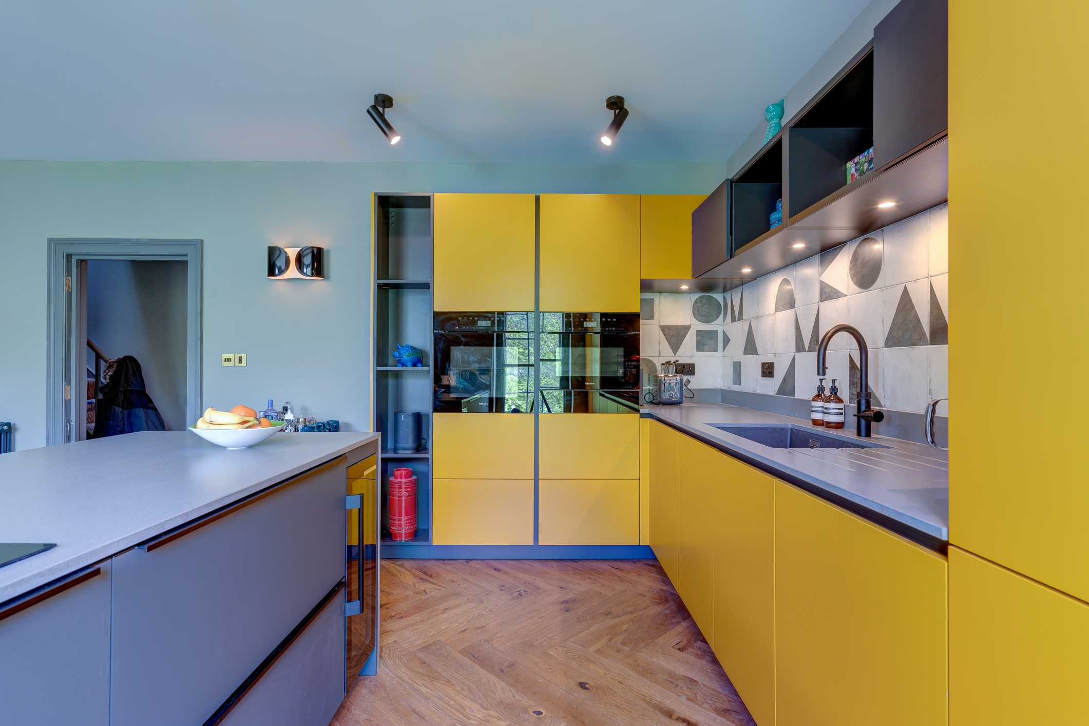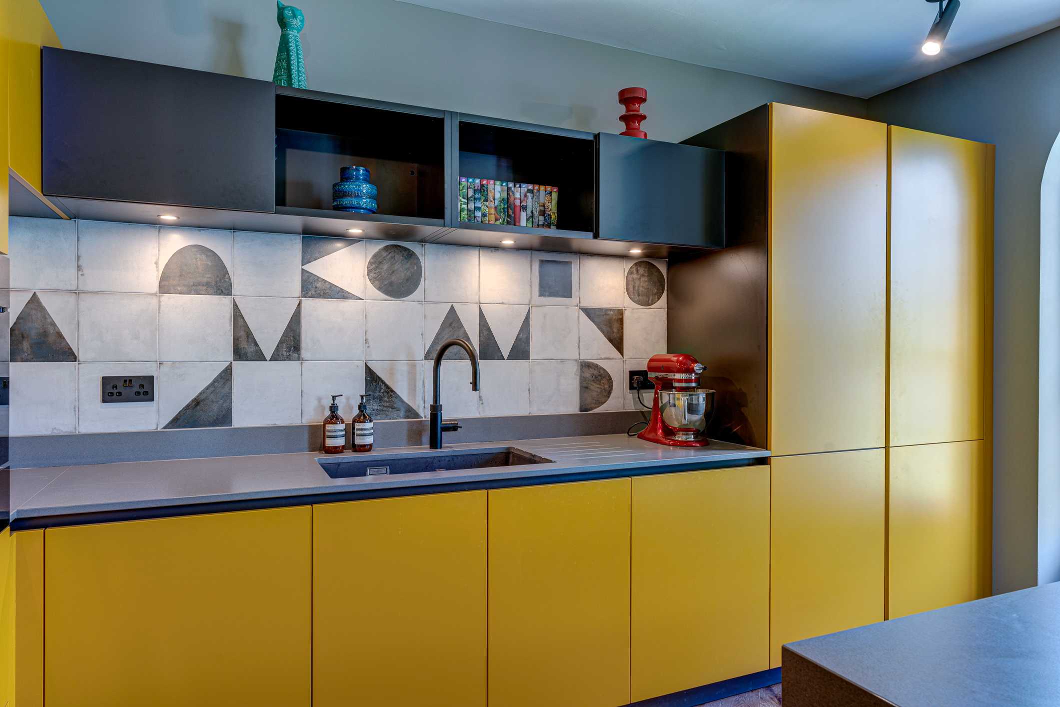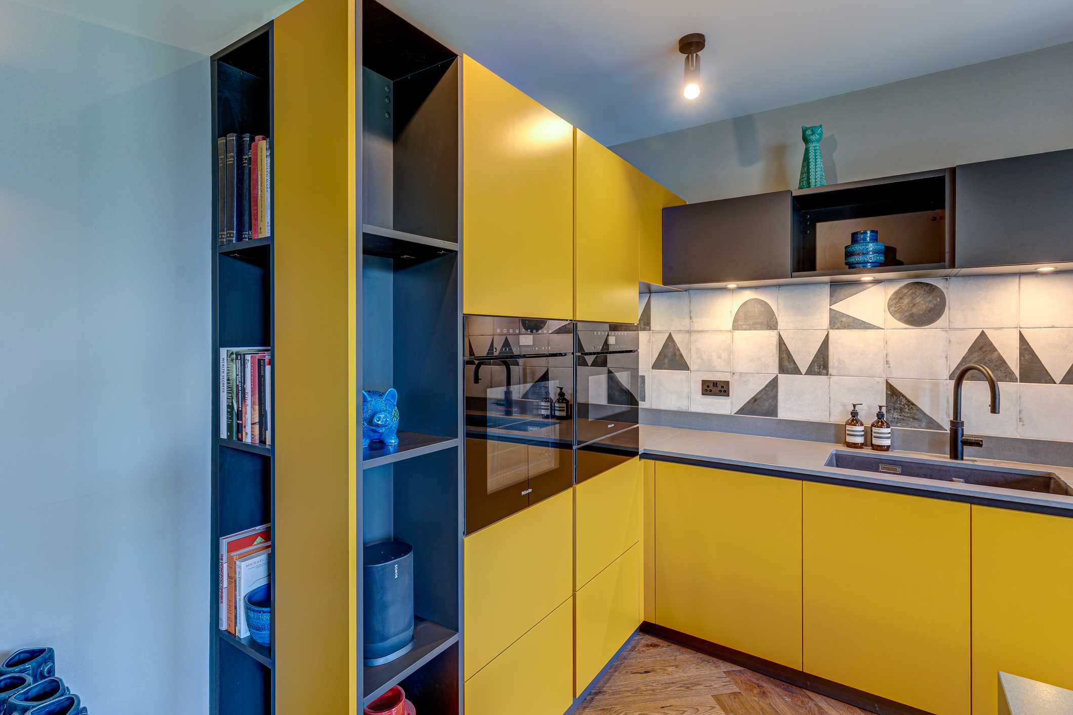 This vibrant Sion Hill, Bristol kitchen is styled in a combination of yellow and grey hues, featuring open display shelves and a striking backsplash that adds a bold touch to the design.