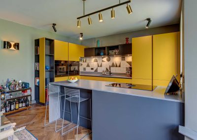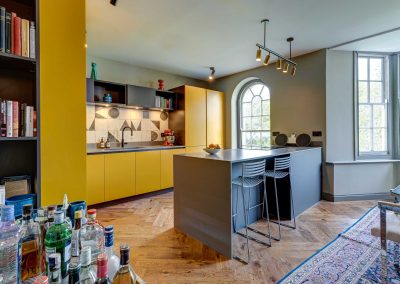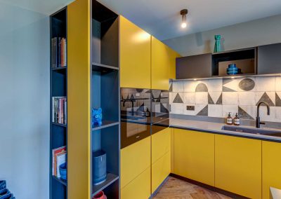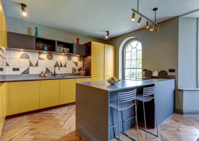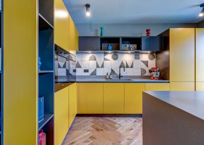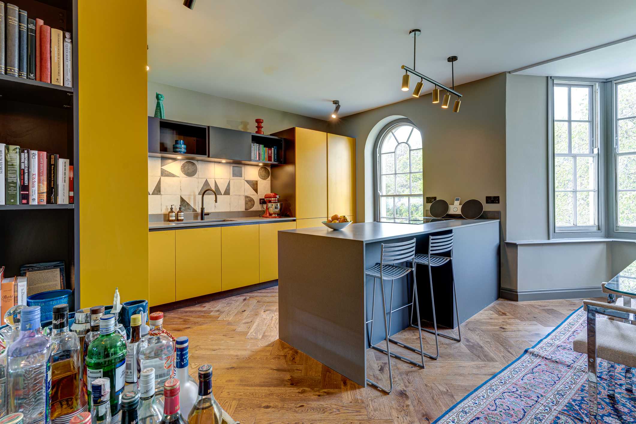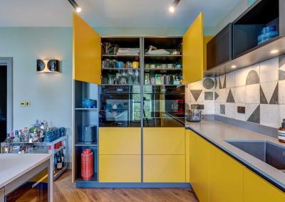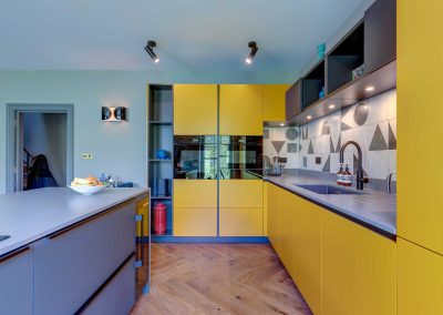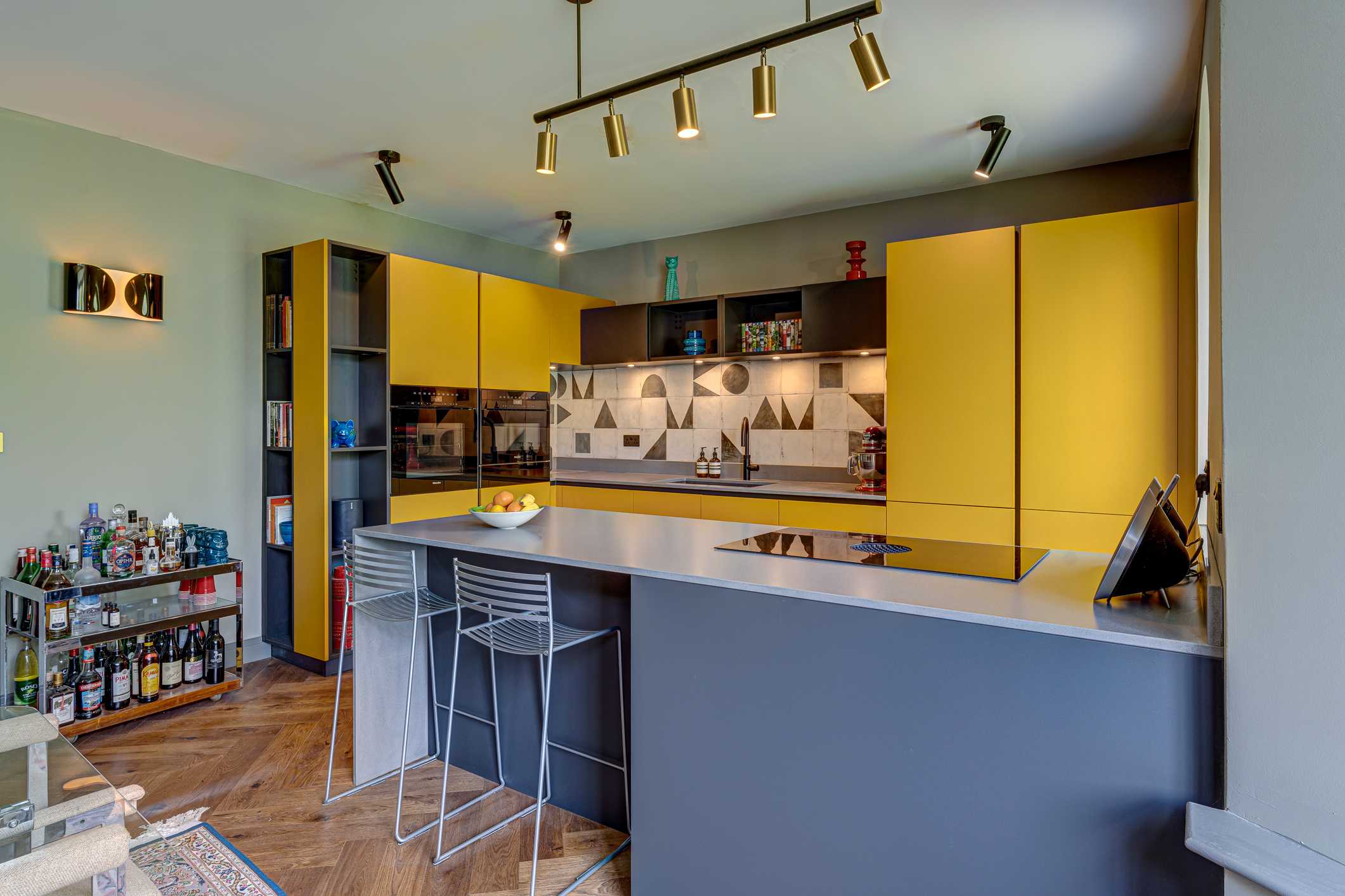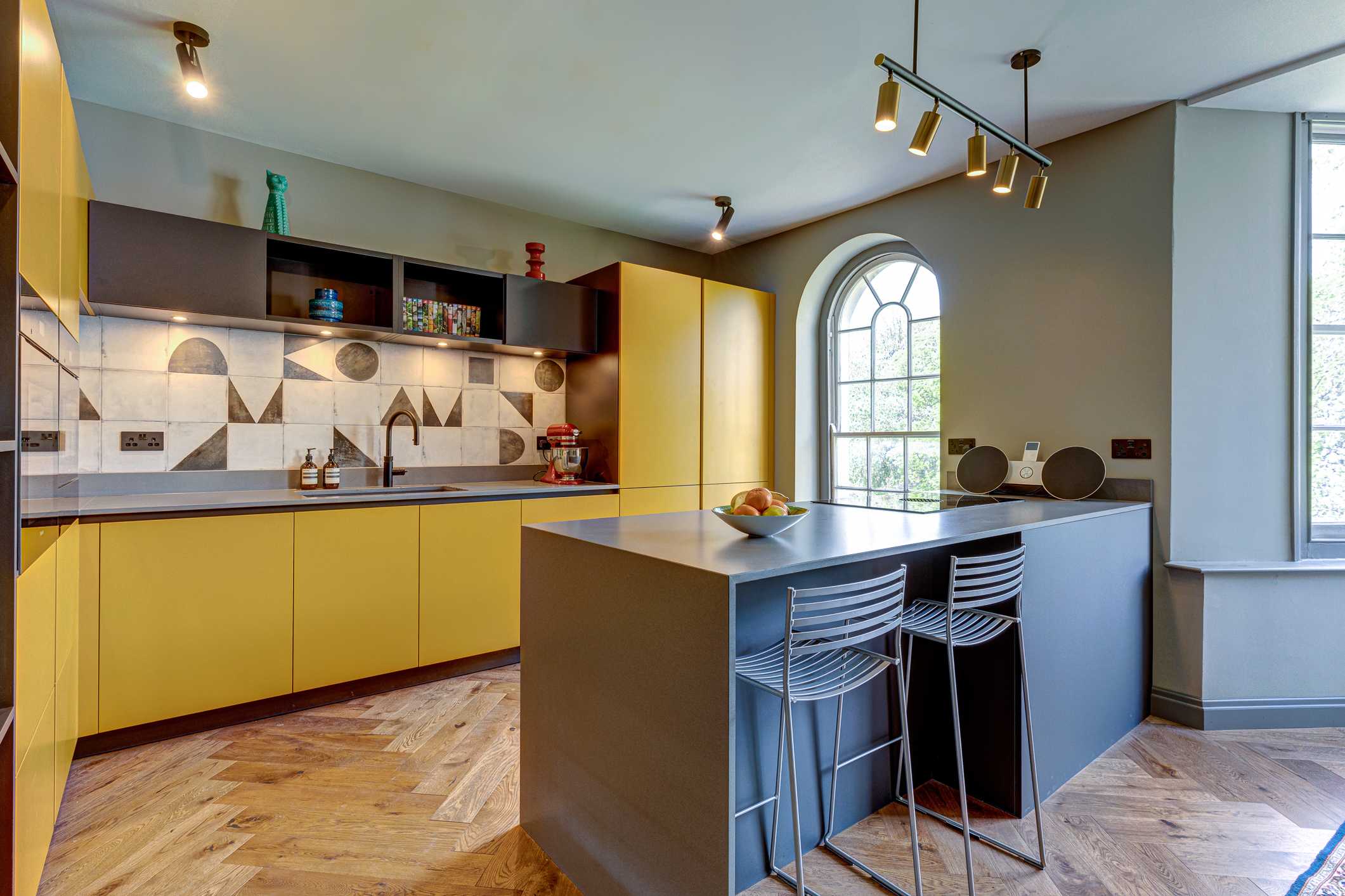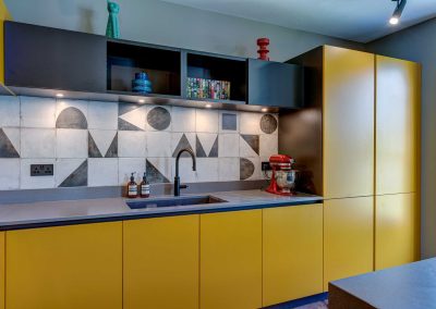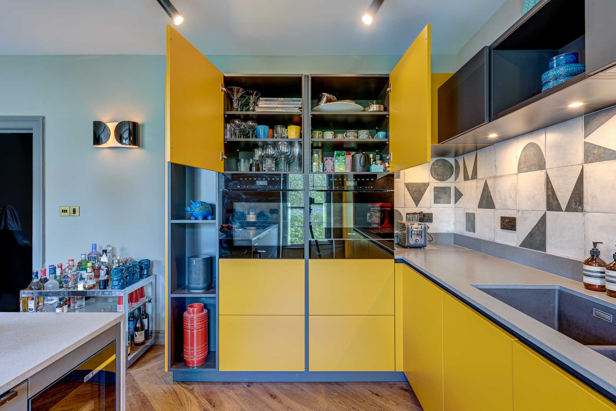 This vibrant Sion Hill, Bristol kitchen is styled in a combination of yellow and grey hues, featuring open display shelves and a striking backsplash that adds a bold touch to the design.