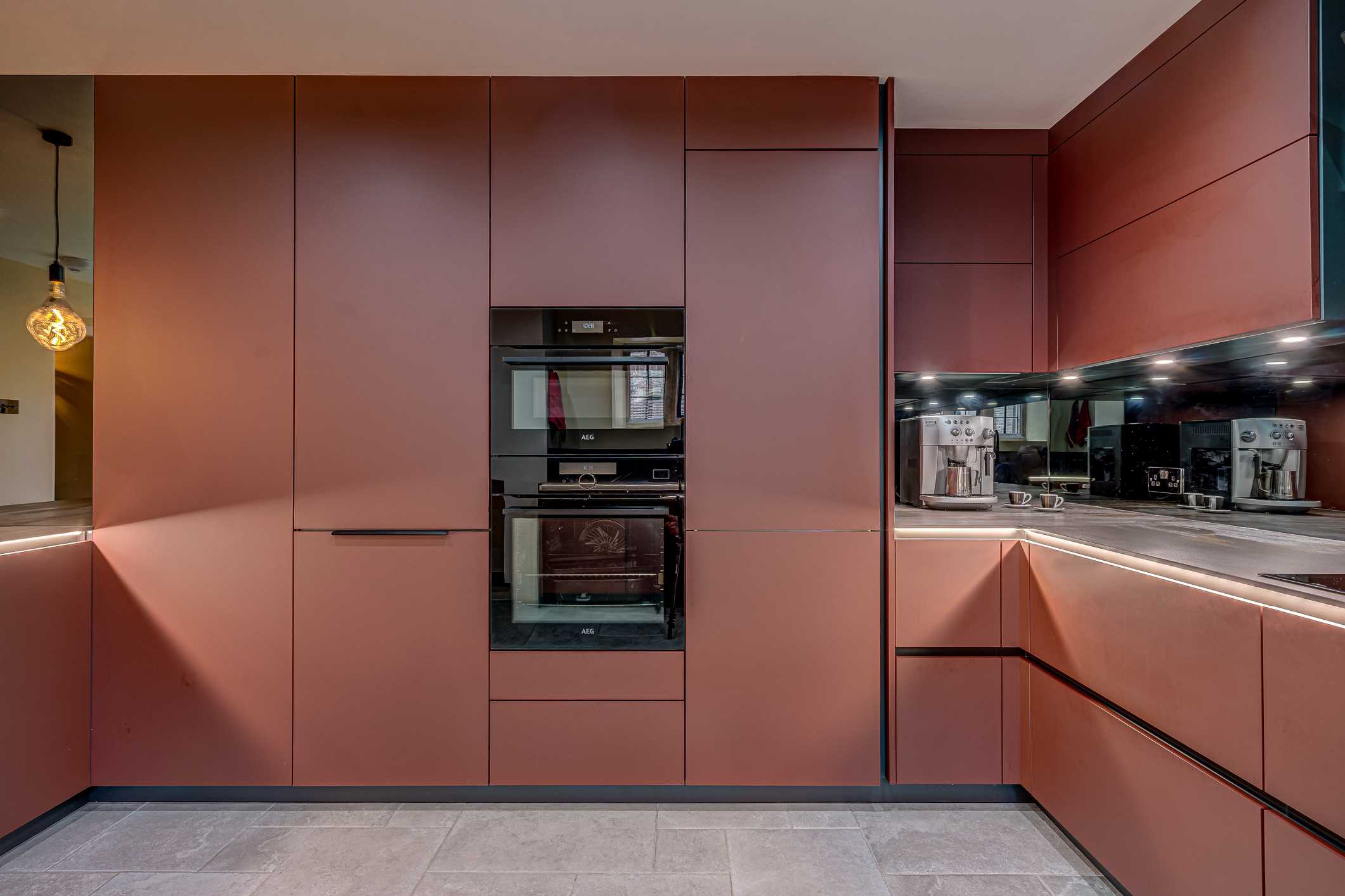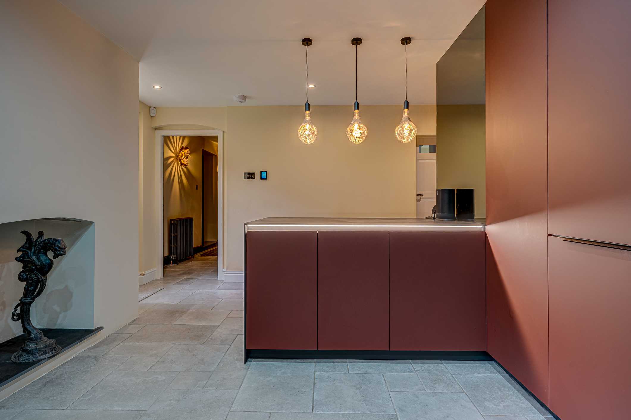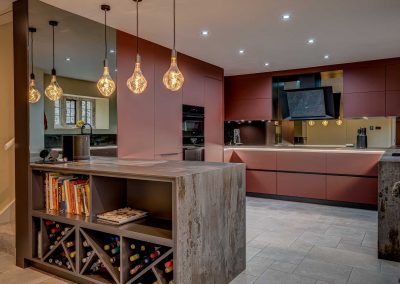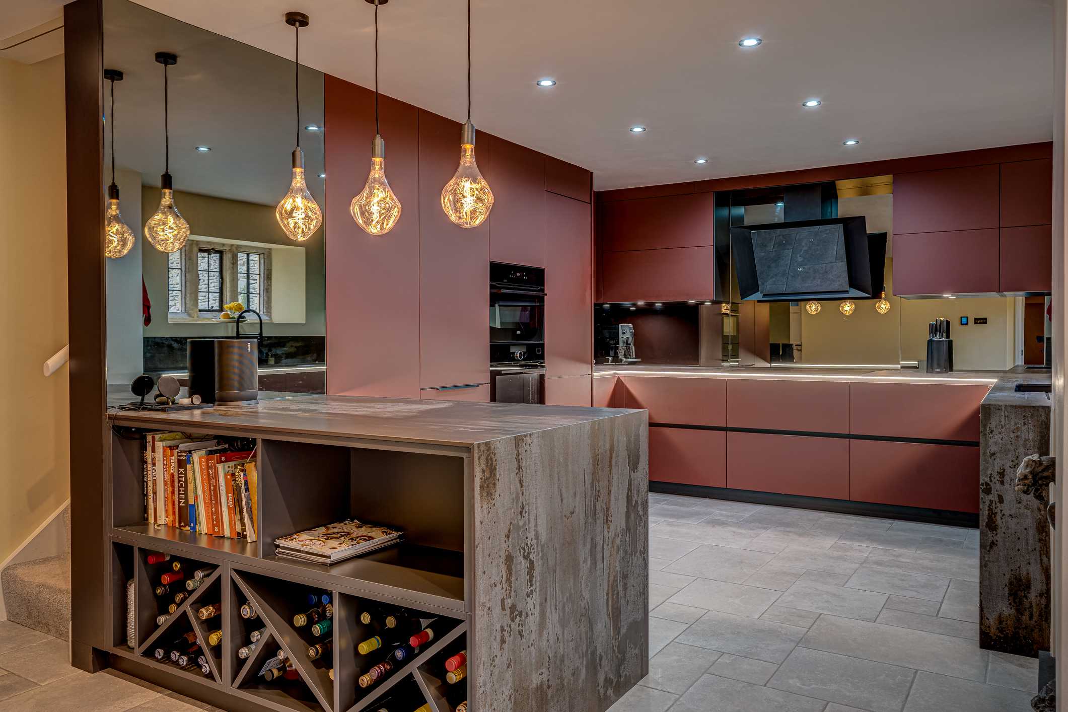 This U-shaped open Nailsea kitchen boasts a lively touch of red and features a textured laminate worktop that mimics earthy tones. The design is elevated with practical elements like open display areas and a wine storage box, contributing to both functionality and aesthetic appeal.