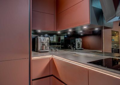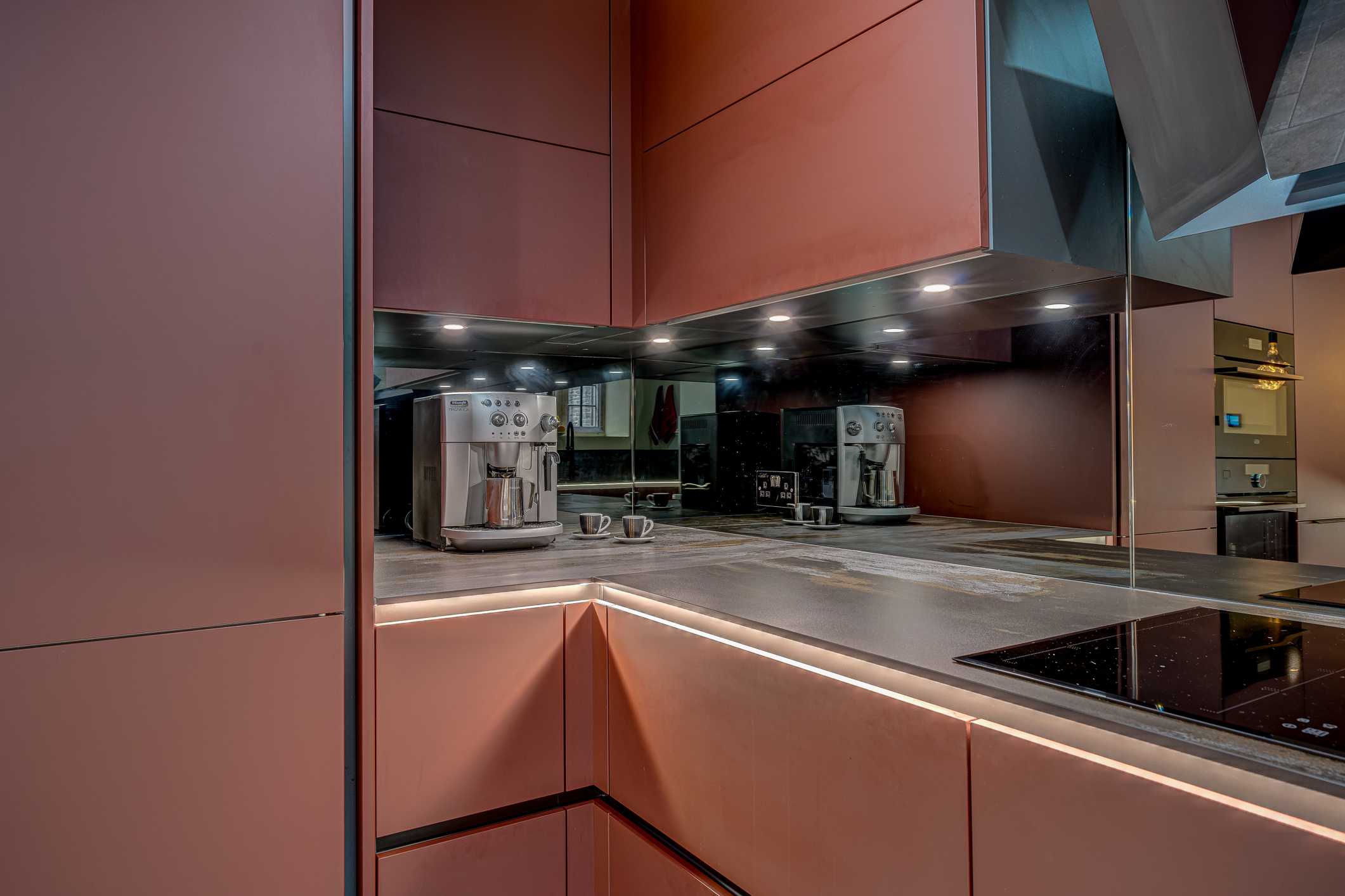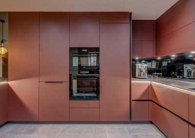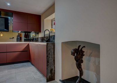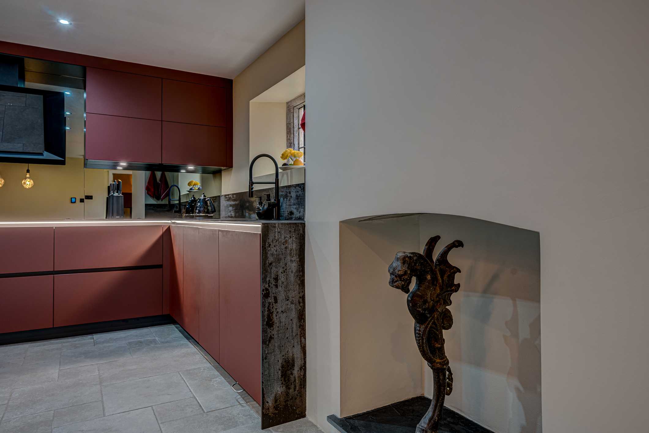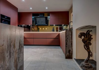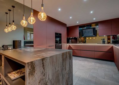 This U-shaped open Nailsea kitchen boasts a lively touch of red and features a textured laminate worktop that mimics earthy tones. The design is elevated with practical elements like open display areas and a wine storage box, contributing to both functionality and aesthetic appeal.